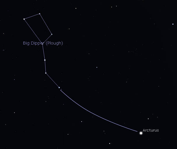 How to find Arcturus nearly a month into spring. Arcturus is in the east in the evening. The Big Dipper is high in the northeast standing on its handle. To find and remember the name of this star, simply follow the arc of the handle to Arcturus. Created using Stellarium and GIMP.