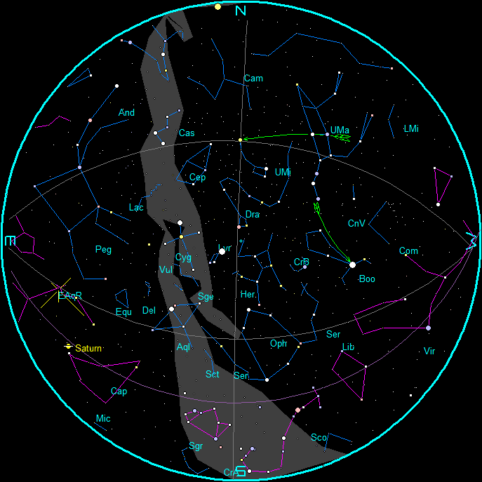 Note the chart times of 11 p.m. and 4 a.m. are for the 15th. For each week before the 15th add ½ hour (28 minutes if you’re picky). For each week after the 15th subtract ½ hour, or 28 minutes. The planet positions are updated each Wednesday on this blog. For planet positions on dates other than the 15th, check the Wednesday planet posts on this blog for weekly positions.