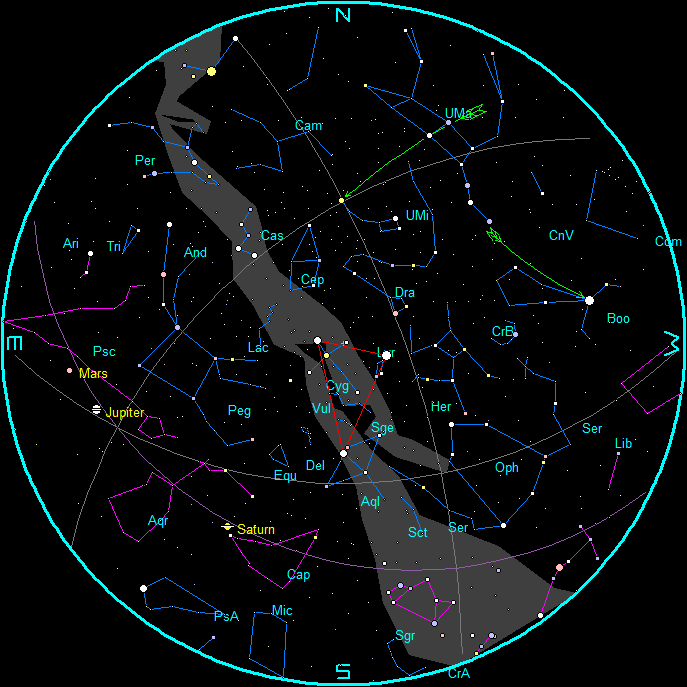 The planets and stars are plotted for the 15th at 11 p.m. EDT in the evening and 4 a.m. for the morning chart. These are the chart times. Note that Interlochen/Traverse City is located approximately 45 minutes behind our time meridian, West 75° longitude. (An hour 45 minutes behind our daylight saving time meridian during EDT). To duplicate the star positions on a planisphere you may have to set it to 1 hour 45 minutes earlier than the current time.