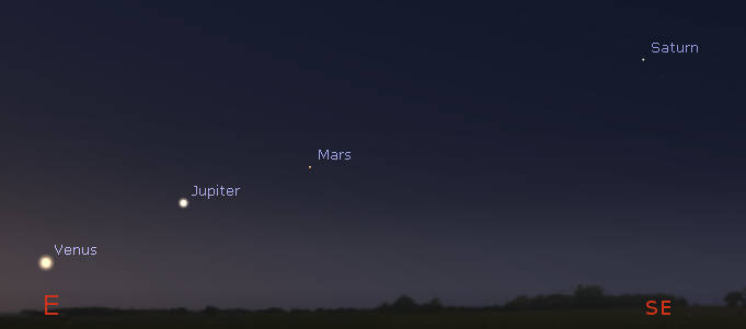 The morning planet parade is widening as Venus is moving away from Jupiter, and Mars is approaching Jupiter. These are shown at 5:15 am, or about an hour before sunrise tomorrow morning, May 12, 2022. Created using Stellarium.