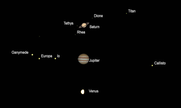 Views of Venus, Jupiter, and Saturn (north up) as they would be seen in a small telescope, with the same magnification, tomorrow morning at 5:15 am, May 12, 2022. I do not show planets less than 10 seconds of arc in diameter. Apparent diameters: Venus 15.42″, 71.6% illuminated; Saturn 16.79″, its rings 39.12″; Jupiter 35.60″. Mars is not shown, its apparent diameter is 5.99″ and is 88.6% illuminated. The ” symbol means seconds of arc (1/3600th of a degree.) Created using Cartes du Ciel (Sky Charts).