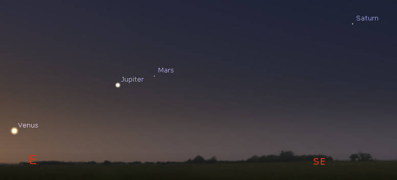 The morning planet parade is widening as Venus is moving away from Jupiter and toward the Sun. Mars is approaching Jupiter and will catch up to it on the 29th. These are shown at 5:15 am, or about an hour before sunrise tomorrow morning, May 19, 2022. Click on the image to enlarge it. Created using Stellarium.