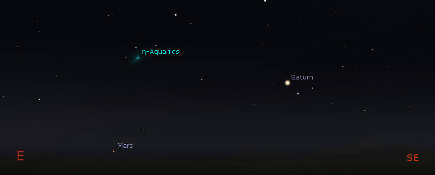 The Eta Aquariid meteor shower radiant as it will be apparent tomorrow morning at 4:30 or at the beginning of nautical twilight. The radiant isn’t a ting that can be seen, but the point from which all the meteors of this shower can be traced back to. The funny looking lower case “n” is the Greek letter eta. The shower is named for the star seen just above the radiant, which is in the center of a small triangle of stars that make up Aquarius’ water jar. Click on the image to enlarge it. Created using Stellarium.