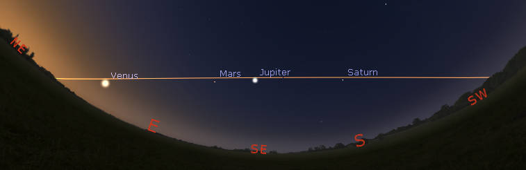 The image above was plotted using the Miller cylindrical projection. While the azimuths are correct, the other plots are not. The planets actually appear to be in a straight line in the sky. I’ve finagled a stereographic projection to show that fact, as seen below.