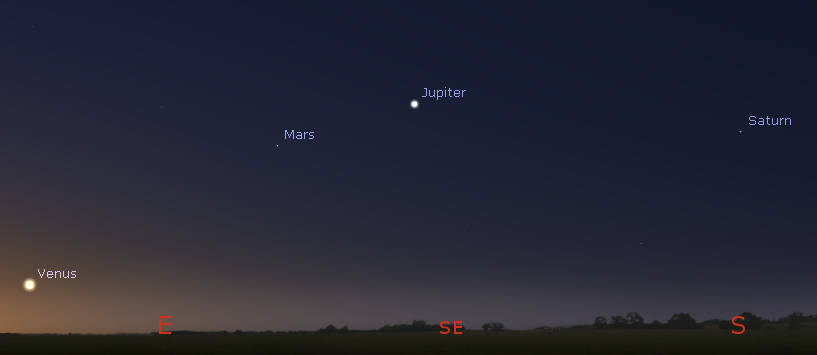 Let’s search for the naked-eye planets for this week. All the naked-eye planets are in the morning sky, although Mercury may be too close to the Sun to be seen. It might just be visible low in the east-northeast after 5. That’s at least for those as far north as we are. At 5 am tomorrow the planets will be spread out from Mercury, actually invisible, near the horizon, brilliant Venus low in the east-northeast to Saturn higher in the south. To the right of Venus, tomorrow morning, stretching from east to southeast, will be the Moon, Mars and Jupiter. Mars is quite a bit dimmer than Jupiter. All will be in line sloping to the upper right with Saturn all by its lonesome in the south. The naked-eye planets are arranged in the morning sky, in the same order as their distances from the Sun.