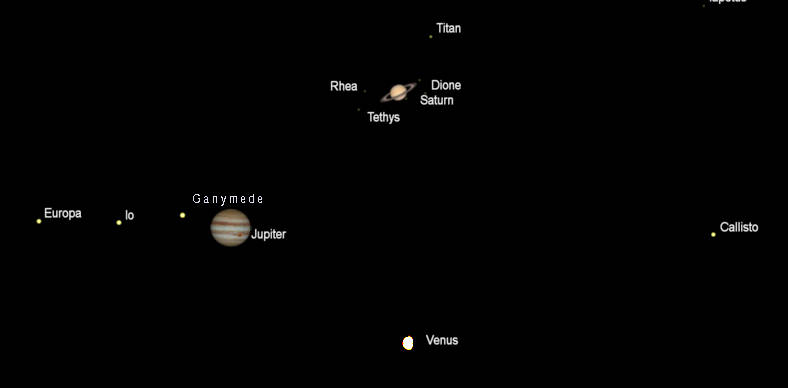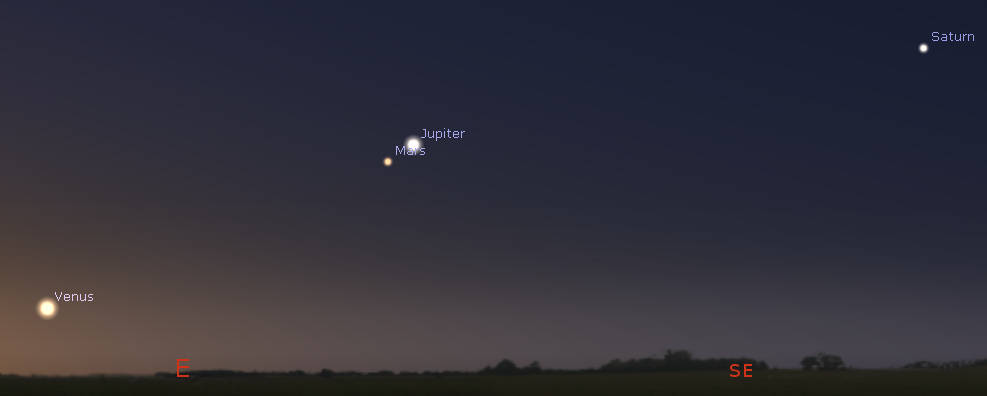Morning planets at 5 am tomorrow morning, June 2, 2022. Click on the image to enlarge it. The span of the planets from Venus to Saturn is 70 degrees. Click on the image to enlarge it. Created using Stellarium.