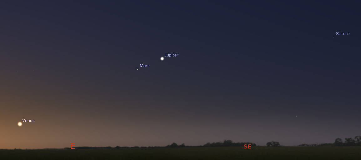Let’s search for the naked-eye planets for this week. All the naked-eye planets are in the morning sky, although Mercury may be too close to the Sun to be seen. It might just be visible low in the east-northeast after 5 am around mid-month. That’s at least for those as far north as we are. At 5 am tomorrow the planets will be spread out from brilliant Venus low in the east to Saturn higher in the south-southeast. To the right of Venus, tomorrow morning, in the east-southeast are Mars and Jupiter. Mars is quite a bit dimmer than Jupiter. All will be in line sloping to the upper right with Saturn all by its lonesome in the south-southeast. The naked-eye planets are arranged in the morning sky, in the same order as their distances from the Sun.