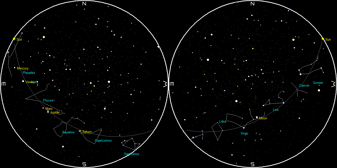 The naked-eye planets and the Moon at sunset and sunrise on a single night, starting with sunset on the right on June 8, 2022. The night ends on the left with sunrise on the 9th. Notice that all the naked-eye planets are in the morning sky now. Click on the image to enlarge it. Created using my LookingUp program.