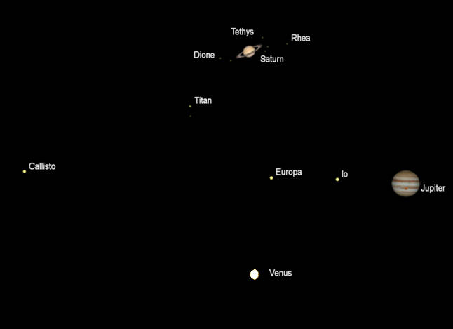 Views of Venus, Jupiter, and Saturn (north up) as they would be seen in a small telescope, with the same magnification, tomorrow morning at 5:00 am, June 9, 2022. I do not show planets less than 10 seconds of arc in diameter. Apparent diameters: Venus 13.10″, 80.3% illuminated; Saturn 17.60″, its rings 41.01″; Jupiter 38.23″. Mars is not shown, its apparent diameter is 6.63″ and is 86.8% illuminated. The ” symbol means seconds of arc (1/3600th of a degree.) Created using Cartes du Ciel (Sky Charts).