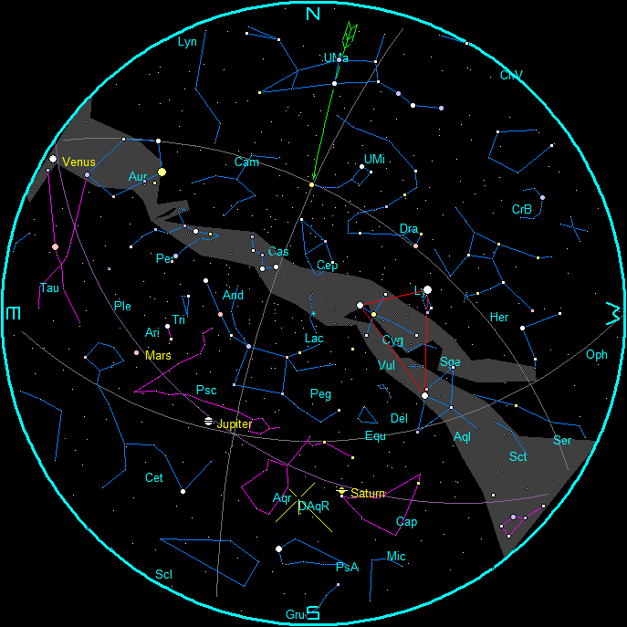 Note the chart times are for the 15th. For each week before the 15th, add ½ hour (28 minutes if you’re picky). For each week after the 15th, subtract ½ hour. The planet positions are updated each Wednesday on this blog. For planet positions on dates other than the 15th.
