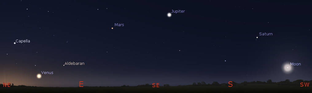 The morning planets and the Moon at 5 am tomorrow morning, July 14, 2022. The planets and Moon actually appear in a straight line in the sky, being placed along the ecliptic, or path of the Sun in the sky. The ecliptic is a great circle on the celestial sphere. Click on the image to enlarge it. The span of the planets from Venus to Saturn is 122 degrees. Two of winter’s first magnitude stars, Aldebaran and Capella, are now visible in morning twilight. Click on the image to enlarge it. Created using Stellarium.