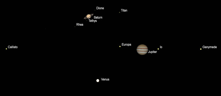 Views of Saturn, Jupiter, and Venus (north up) as they would be seen in a small telescope, with the same magnification, tomorrow morning at 5:00 am, July 14, 2022. I do not show planets less than 10 seconds of arc in diameter. Apparent diameters: Saturn 18.46″, its rings 43.01″; Jupiter 42.63″. Mars is not shown, its apparent diameter is 7.63″; Venus 11.31″. The ” symbol means seconds of arc (1/3600th of a degree.) Click on the image to enlarge it. Created using Cartes du Ciel (Sky Charts).