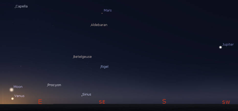 Morning planets with the bright winter stars at 6:15 am tomorrow, September 1, 2022. Click on the image to enlarge it. Created using Stellarium.