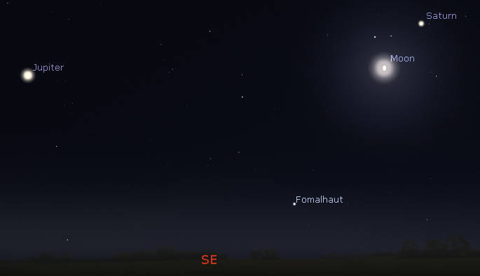 Let’s search for the naked-eye planets for this week. The waxing gibbous Moon will be visible near Saturn tonight, with the ringed planet right and above our Moon. Super bright Jupiter is to the far right of the Moon at 9 pm in the east southeast, the brightest star-like object in the sky. Jupiter is seen against the stars of Pisces the fish, while Saturn is spotted in the eastern end of Capricornus the sea goat. I don’t think the stars will be visible with the bright Moon. One star in their direction may be visible and low on the horizon and in line tonight with Saturn and the Moon. It’s Fomalhaut, normally the loneliest star in the sky. Before seven tomorrow morning, the red planet Mars will be high in the south, above the winter constellation of Orion. At that hour, Mercury can also be spotted low in the east.cc