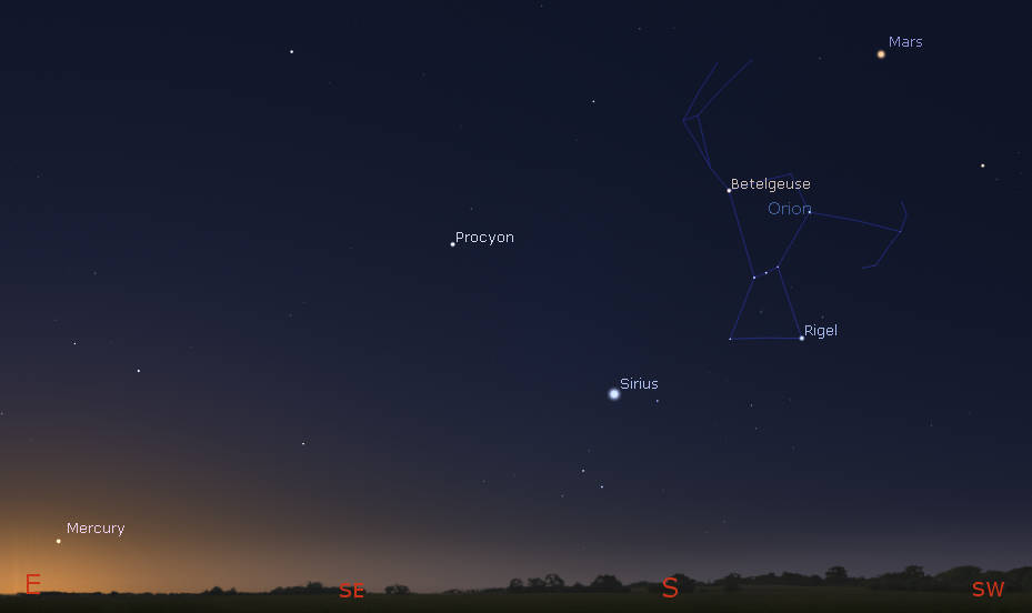 Morning planets, Mars and Mercury with the winter stars and Orion at 7 am tomorrow morning, October 6, 2022. Click on the image to enlarge it. Created using Stellarium.