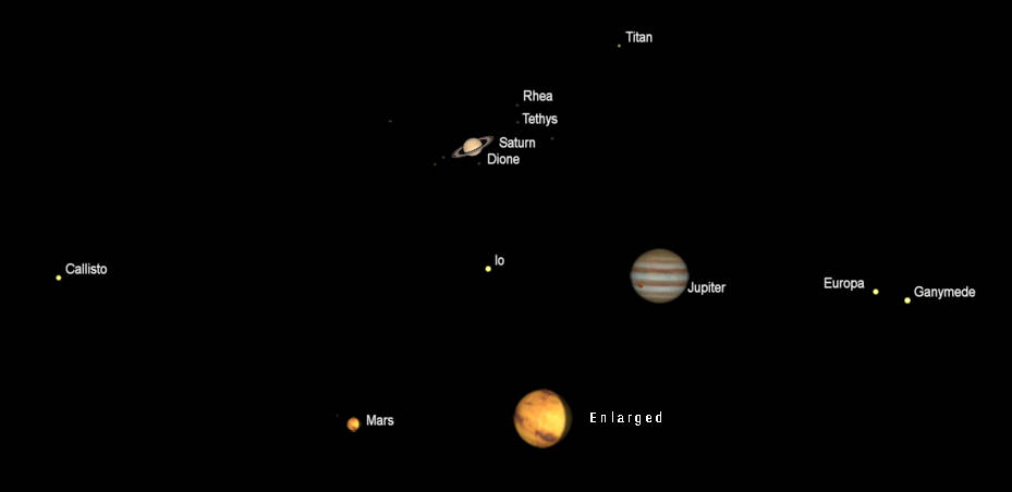 Telescopic views of Saturn Jupiter and Mars (north up) as they would be seen in a small telescope, with the same magnification. The image doesn’t show it, but the white north polar cap will appear at the top or north limb of Mars. Saturn and Jupiter are shown at 9 pm, Mars at 6 am. I do not show planets less than 10 seconds of arc in diameter. Apparent diameters: Saturn 18.00″, its rings 41.91″; Jupiter 49.69″. Mars 12.44″. Mars’ distance is 69.7 million miles (112.2 million kilometers). Mercury, which isn’t shown, is 7.51″ in diameter and 40.8% illuminated. The ” symbol means seconds of arc (1/3600th of a degree.) Click on the image to enlarge it. Created using Cartes du Ciel (Sky Charts).