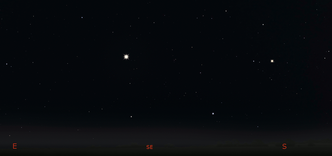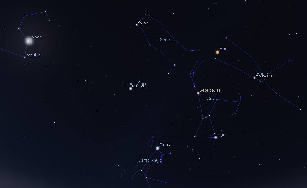 Mars among the winter stars at 7 tomorrow morning, October 20, 2022. Click on the image to enlarge it. Created using Stellarium.