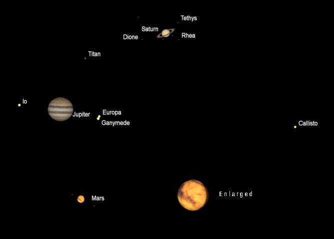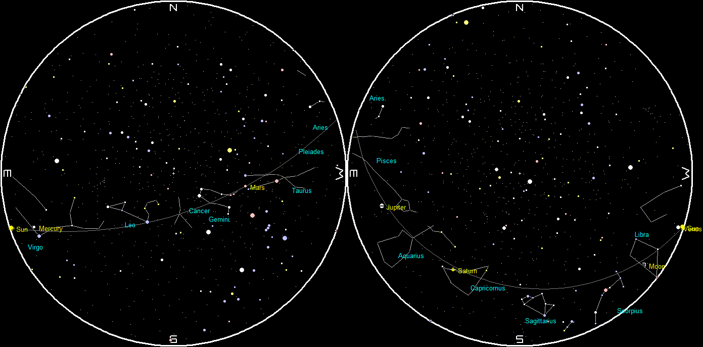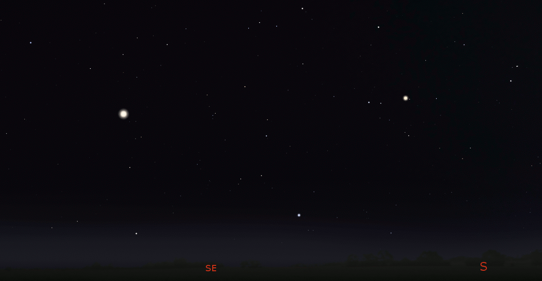 Telescopic views of Saturn Jupiter and Mars (north up) as they would be seen in a small telescope, with the same magnification. The image of Mars doesn’t show it, but the white north polar cap will appear at the top or north limb of Mars. Saturn and Jupiter are shown at 8 pm, Mars at 11 pm. Apparent diameters: Saturn 17.41″, its rings 40.55″; Jupiter 48.16″. Mars 14.58″. Mars’ distance is 59.7 million miles (96.2 million kilometers). The ” symbol means seconds of arc (1/3600th of a degree.) Click on the image to enlarge it. Created using Cartes du Ciel (Sky Charts).