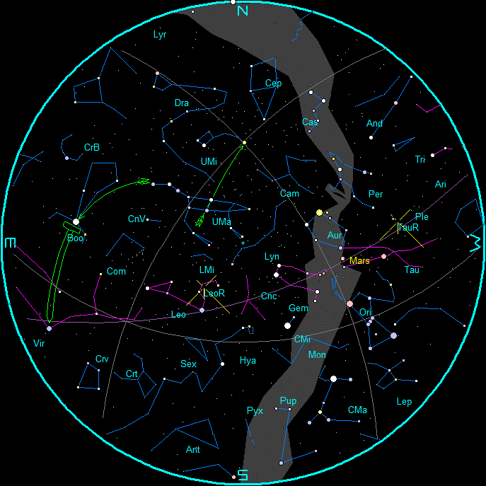 • Follow the arc of the handle of the Big Dipper to the star Arcturus