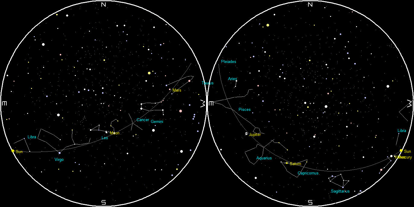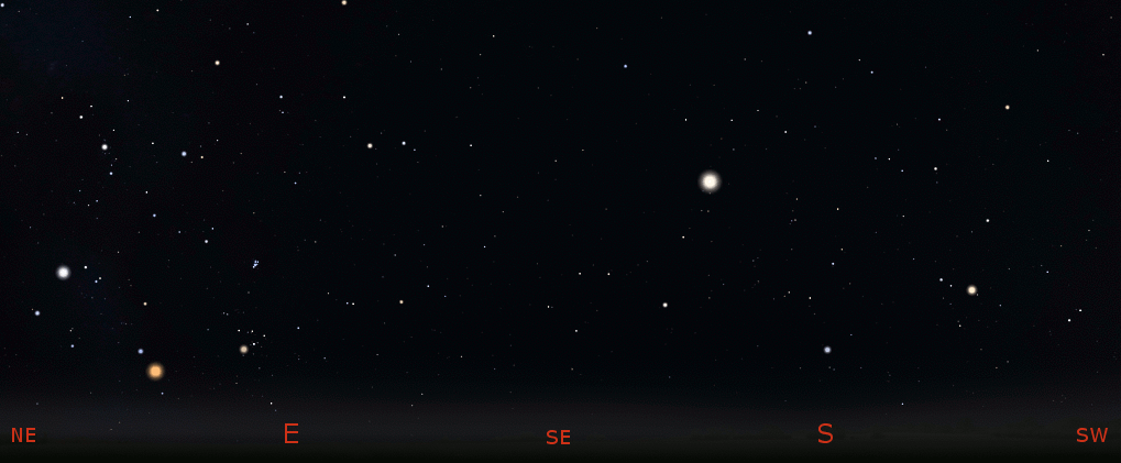 Let’s see where the naked-eye planets have wandered off to this week. Jupiter and Saturn will be visible this evening, in the southeastern sky, as soon after sunset as it will be dark enough to see them, which would be by 6 pm. Jupiter is the brighter of the two to the left, in the southeast, while dimmer Saturn is in the south. The red planet Mars, though a morning planet, will rise tonight at 6:43 pm in the east-northeast. It’s located between the tips of the long horns of Taurus the bull. Mars is beginning to move westward in its retrograde motion as the Earth is starting to pass it. Which it will do in three weeks time. Venus and Mercury, though in the evening sky, are too close to the Sun to be seen.