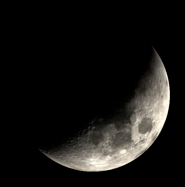 Waxing crescent Moon as it might appear in binoculars or low power telescope tonight, December 28, 2022. Created using Stellarium, LibreOffice Draw and GIMP