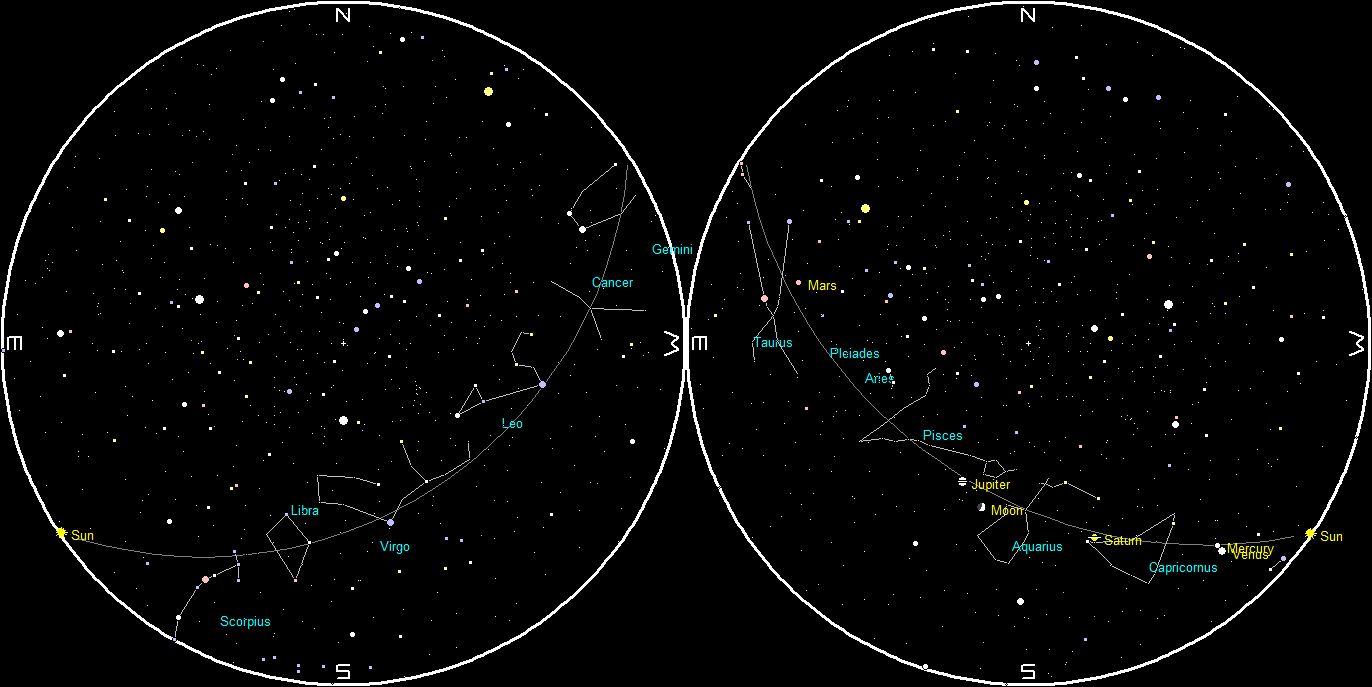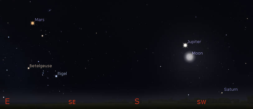 Let’s see where the naked-eye planets have wandered off to this week. Mars, Jupiter and Saturn will be visible this evening, in the east to southwestern sky at 6:30 pm. Mars is in the east. Jupiter is the brightest of the three in the south, while dimmer Saturn is low in the southwest at that time. Mars is above Orion as it rises in the early evening. Saturn, the westernmost of the bright planets, will set around 8:52 this evening. Venus and Mercury are also in the evening sky, but too close to the setting Sun to be easily spotted. At 6 pm, both will be very low on the southwestern horizon, with Mercury just above Venus by three moon-widths. There are now no bright morning planets, though Mars won’t set until 6:32 am in the northwest.