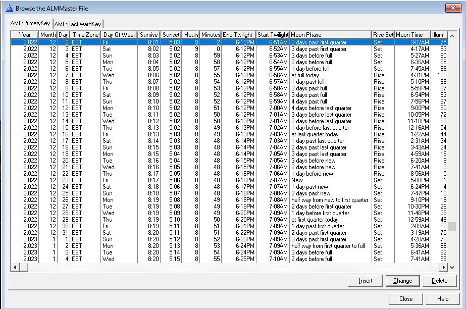 Almanac Master database table. This is created from a file created annually by my LookingUp for MS-DOS program. The moon phase verbiage is created during the conversion process from the comma delimited file in the Ephemeris Helper program. I use this database table to create the intro to each day’s radio program.