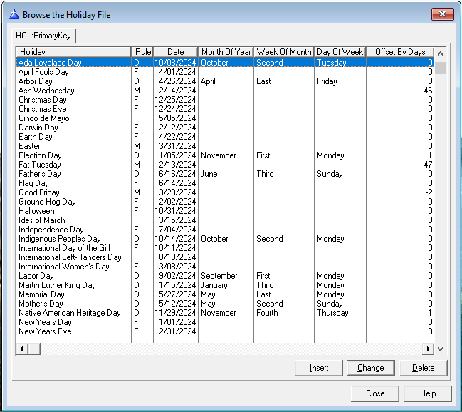 The Holiday table is used in the intro to acknowledge that today is a special day or holiday. The Rule determines how the date is determined. F is for fixed date, D for day of week and week of month, and M for movable feast for dates based on Easter.