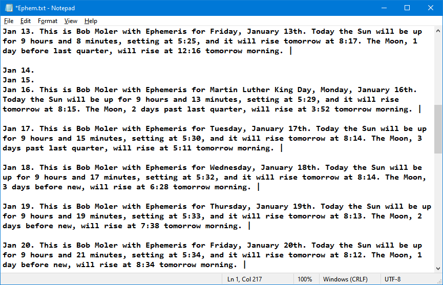 This is a text file produced by the Intro generated function of the Ephemeris Helper program. This file is pasted into the Ephemeris document, where I add the rest of the content. The dates with no intros are Saturday and Sunday. I also use two more files of astronomical events, which I add after the intros to help me with program topics. The intro has two formats, depending on whether the Sun rises before or after the start of the last airing of Ephemeris that day.
