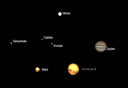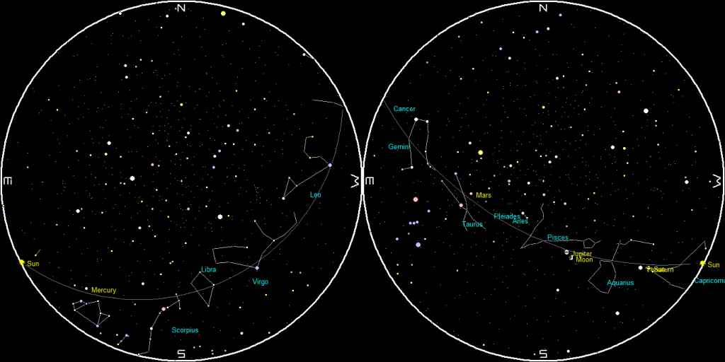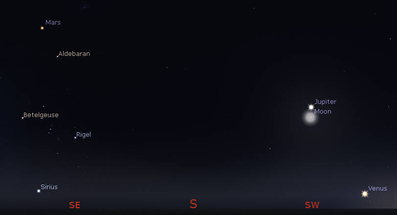 Let’s see where the naked-eye planets have wandered off to this week. Very early after sunset, Venus might be spotted very low in the southwest by a little past 6 pm. Mars, and Jupiter will be visible this evening, in the east to southwestern sky by 6:30 or 7 pm. Mars will be above Orion in the east-southeast and is pulling away from the Pleiades. Jupiter is brighter than Mars, and will be in the south-southwest, and tonight it’s directly above the crescent Moon. Saturn is below Venus now, so it’s pretty much gone until it reappears in the morning sky in a few months. Mercury is now in the morning sky, after it passed inferior conjunction with the Sun on the 7th, that is, it passed between the Earth and the Sun. It should be briefly visible before sunrise by month’s end.