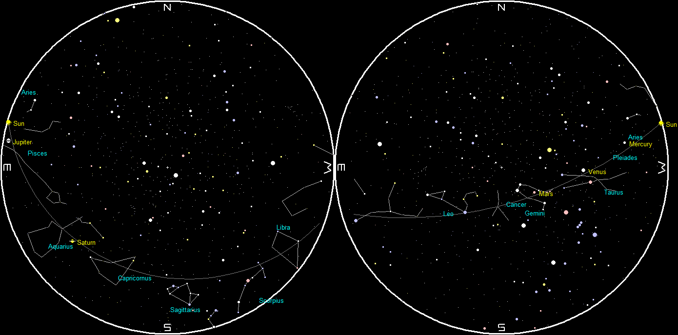 Let’s find where the naked-eye planets have wandered off to this week. Since I left you in February, Jupiter passed behind the Sun 8 days ago and moved to the morning side of the Sun. Though it will be more than a month before it is far enough from the Sun to be spotted before sunrise. Venus is our blazing Evening Star, seen in the west all evening. It will set shortly after midnight. It’s in Taurus, with the bright star Aldebaran below and left of it and the Pleiades below and right of it. Mars is above and left of Venus. Venus is closing the gap, but will never quite reach Mars while they are in the evening sky. The closest they will get is three and a half degrees or 7 moon diameters apart, but won’t cross paths until February of next year. In the morning sky, Saturn is now visible by 6 am in the east-southeast.