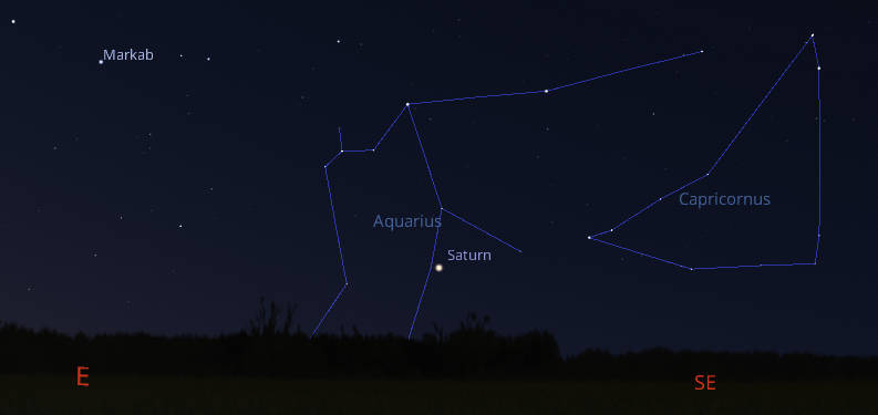 Let’s find where the naked-eye planets have wandered off to this week. Venus is our blazing Evening Star, seen in the west all evening. It will set after midnight. It’s in Gemini, below the namesake stars of the twins Castor on the right and Pollux on the left. Pollux is a bit below and to the right of the Moon tonight. Mars is above and left of Venus. Venus is closing the gap between them, but will never quite reach Mars while they are in the evening sky. The closest they will get is three and a half degrees or 7 moon diameters apart, before Venus pulls back toward the Sun faster than Mars. They won’t cross paths until February of next year. Saturn is emerging from morning twilight, rising at 4:33 am in the east-southeast. Both Jupiter and Mercury are too close to the direction of the Sun to be seen.