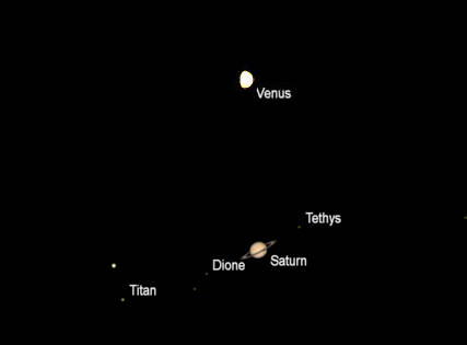 Telescopic Venus and Saturn (north up) as they would be seen in a small telescope, with the same magnification. Apparent diameters: Venus 16.51″ and is 68.1% illuminated; Saturn 16.23″, its rings 37.80″. Mars is too small to be represented here. It is 5.5″ in diameter. Created using Cartes du Ciel (Sky Charts).