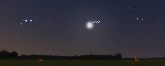 Saturn and the Moon in the morning sky at 5:30 am. Note the Sagittarius’ Teapot asterism on the right. Created using Stellarium.