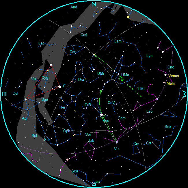 The planets and stars are plotted for the 15th at 11 p.m. EDT in the evening and 4 a.m. for the morning chart. These are the chart times. Note that Interlochen/Traverse City is located approximately 45 minutes behind our time meridian, West 75° longitude. (An hour 45 minutes behind our daylight saving time meridian during EDT). To duplicate the star positions on a planisphere you may have to set it to 1 hour 45 minutes earlier than the current time.