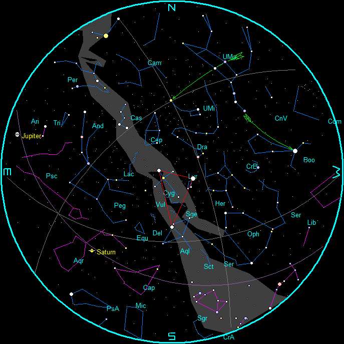 Note, the chart times of 11 p.m. and 4 a.m. are for the 15th. For each week before the 15th, add ½ hour (28 minutes if you’re picky). For each week after the 15th, subtract ½ hour, or 28 minutes. The planet positions are updated each Wednesday on this blog. For planet positions on dates other than the 15th, check the Wednesday planet posts on this blog for weekly positions.