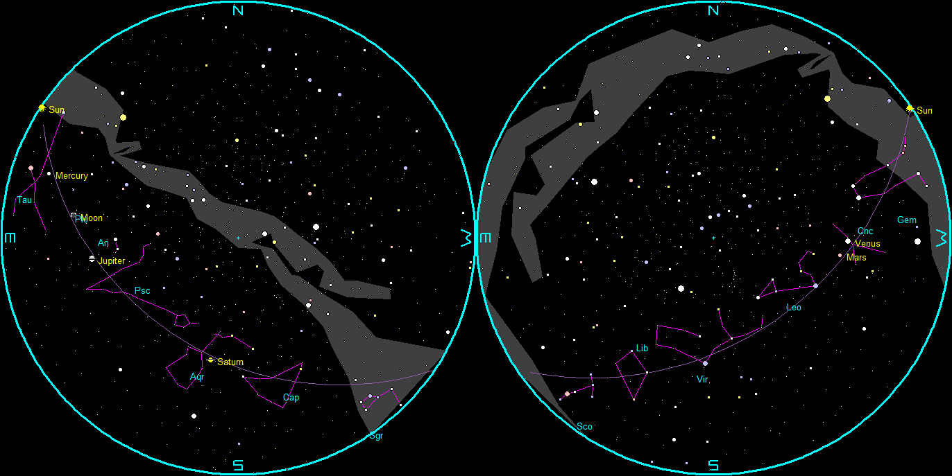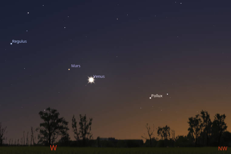 Let’s find out where the naked-eye planets have wandered off to this week. Venus is our blazing Evening Star seen in the west all evening. It will set after midnight. The red planet Mars is seen left of and a bit higher than Venus by six and a half degrees, or a bit more than half the width of one’s fist held at arm’s length. Venus is closing the gap between them, but will never quite reach Mars while they are in the evening sky. The closest they will get is three and a half degrees or seven moon diameters apart, before Venus pulls back toward the Sun faster than Mars will. Both Mars and Venus are in Cancer. In the morning, Saturn will be visible low in the south-southeast at 5 am. Jupiter will be very low in the east at that hour.