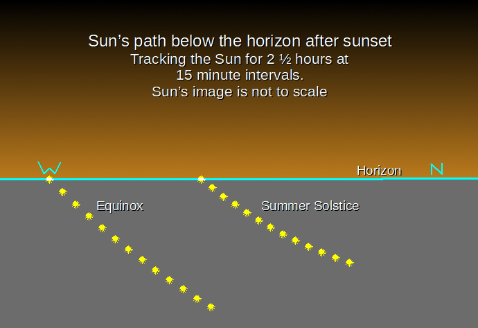 Not only does the Sun set later this time of year, but twilight lasts longer too. As of tonight the end of astronomical twilight, when the last vestiges of twilight are gone is, for the Traverse City/Interlochen area, 12:01 am, That’s two and a half hours of evening twilight. I feel that for most purposes that the end of nautical twilight, when navigators on ships could no longer see the horizon for their sextant readings, is dark enough to view most stars, and brighter objects beyond the solar system, what we call deep sky objects. That happens at 10:56 pm, or about an hour and a half after sunset. Twilight of both kinds are a third shorter around the equinoxes. These times are dependent on our latitude, and the Sun’s declination which is equivalent to latitude.