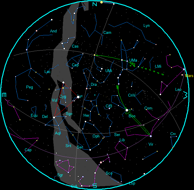 The planets and stars are plotted for the 15th at 11 p.m. EDT in the evening and 4 a.m. for the morning chart. These are the chart times. Note that Interlochen/Traverse City is located approximately 45 minutes behind our time meridian, West 75° longitude. (An hour 45 minutes behind our daylight saving time meridian during EDT). To duplicate the star positions on a planisphere you may have to set it to 1 hour 45 minutes earlier than the current time.