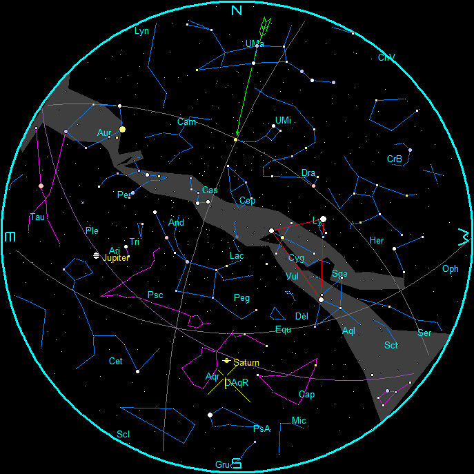 Note, the chart times of 11 p.m. and 4 a.m. are for the 15th. For each week before the 15th, add ½ hour (28 minutes if you’re picky). For each week after the 15th, subtract ½ hour, or 28 minutes. The planet positions are updated each Wednesday on this blog. For planet positions on dates other than the 15th, check the Wednesday planet posts on this blog for weekly positions.
