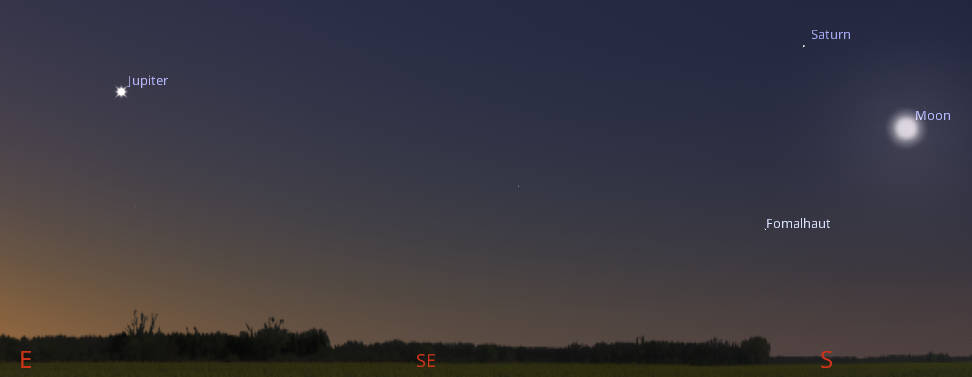 Jupiter, Saturn and the waning gibbous Moon seen at 5:15 am, about an hour before sunrise tomorrow morning, July 6, 2023. Fomalhaut, the loneliest star in the sky, is also visible. It’s kept company by Saturn for a few years every 30 years. Click or tap on the image to enlarge it. Created using Stellarium.