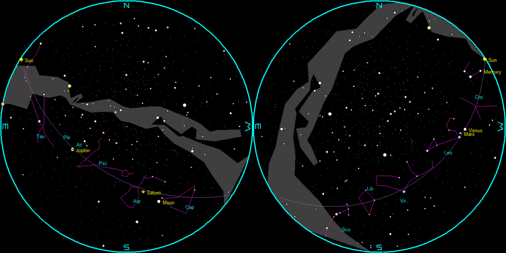 Let’s find out where the naked-eye planets have wandered off to this week. Venus is our blazing Evening Star, seen low in the west most of the evening. It sets tonight at 11:28 pm, and by three minutes earlier each night. The red planet Mars is seen left of and above Venus. And left of Mars is the brighter star Regulus in Leo the lion. Venus is pulling away from Mars now. Mars is much fainter than Venus and difficult to spot in twilight. Saturn will rise shortly after midnight. And by 5:15 am will appear in the south, the brightest “star” in that direction. It will appear above and left of the waning gibbous Moon at that hour. Jupiter will be in the east at that hour. It is the brightest star-like object in the morning sky now.