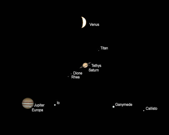 Telescopic Venus, Saturn and Jupiter (north up) as they would be seen in a small telescope, with the same magnification at 10:15 pm July 5, 2023, for Venus and 5:15 am July 6, 2023, for Jupiter and Saturn. Apparent diameters: Venus 36.21″ and is 28.1% illuminated; Saturn 18.18″, its rings 42.35″; Jupiter 37.04″. Mars, too small to be represented here, is 4.18″ in diameter. Venus, Saturn and Jupiter are approaching us, so their apparent diameters are growing. Europa is transiting in front of Jupiter. Normally it would not be visible. The ” symbol means seconds of arc (1/3600th of a degree.) Click or tap on the image to enlarge it. Created using Cartes du Ciel (Sky Charts).