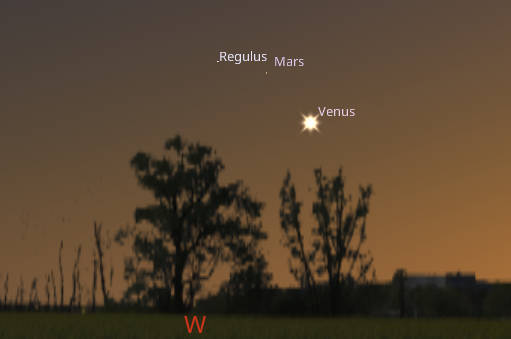 Venus, Mars and bright star Regulus can be seen low in the west at 10:15 pm EDT, or about 45 minutes after sunset, tonight July 5, 2023. Created using Stellarium.