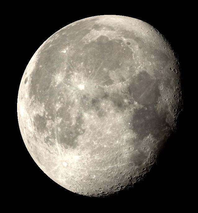 Waning gibbous Moon with labels as it might be seen at 5:15 am, about one hour before sunrise tomorrow, July 5, 2023. Created using Stellarium, LibreOffice Draw, and GIMP.