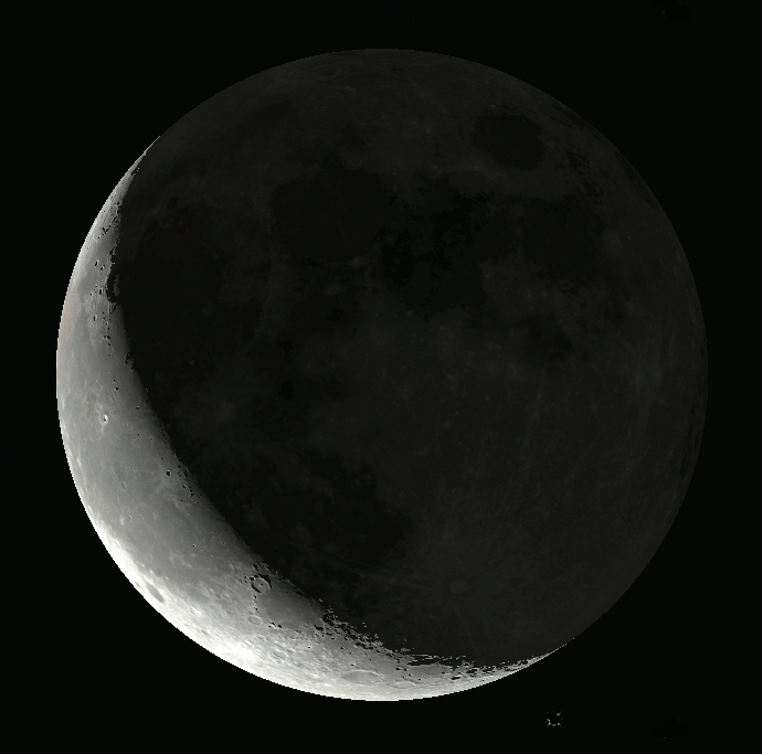 The Moon as it might appear tomorrow morning, July 13, 2023. The whole Moon might be visible due to earthshine (The nearly full Earth, from the Moon’s perspective, illuminating its night side). Click on the image to enlarge. Created using Stellarium, Libreoffice Draw, and GIMP.