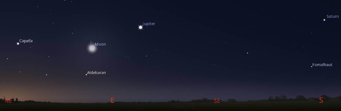 Let’s find out where the naked-eye planets have wandered off to this week. Tonight, Venus is our blazing Evening Star, seen very low in the west in evening twilight. It will set at 11:06 pm, and by four minutes earlier each night. The red planet Mars is seen left of and above Venus. It’s the second “star” with the brighter real star Regulus in Leo the lion between it and Venus. Mars is much fainter than Venus and difficult to spot in twilight. Saturn will rise shortly before midnight. And by 5 am tomorrow, will appear in the south, the brightest “star” in that direction. Jupiter will be in the east at that hour. It will appear above and right of the waning crescent Moon at that hour. Jupiter is the brightest star-like object in the morning sky now.