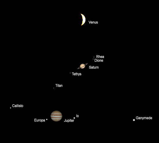 Telescopic Venus, Saturn and Jupiter (north up) as they would be seen in a small telescope, with the same magnification at 10:15 pm July 12, 2023, for Venus and 5:00 am July 13, 2023, for Jupiter and Saturn. Apparent diameters: Venus 40.49″ and is 22.0% illuminated; Saturn 18.36″, its rings 42.77″; Jupiter 37.73″. Mars, too small to be represented here, is 4.18″ in diameter. Venus now appears larger than Jupiter. Venus, Saturn and Jupiter are approaching us, so their apparent diameters are growing. Europa is casting its shadow on Jupiter, see the small dot below center on the planet. The ” symbol means seconds of arc (1/3600th of a degree.) Click or tap on the image to enlarge it. Created using Cartes du Ciel (Sky Charts).