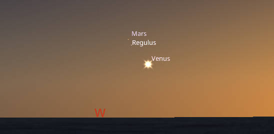 Venus, Regulus and Mars as they might appear tonight, July 12, 2023 at 10:15 or about 45 minutes after sunset. Venus would be about 8 1/2 degrees above a flat horizon. At this time, Venus would appear a bit higher from south of our approximately 45 degrees north latitude, and lower north of here. Created using Stellarium.