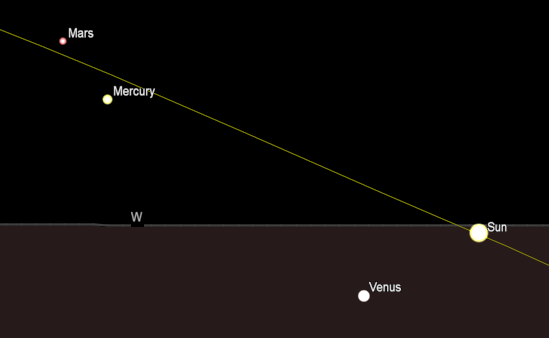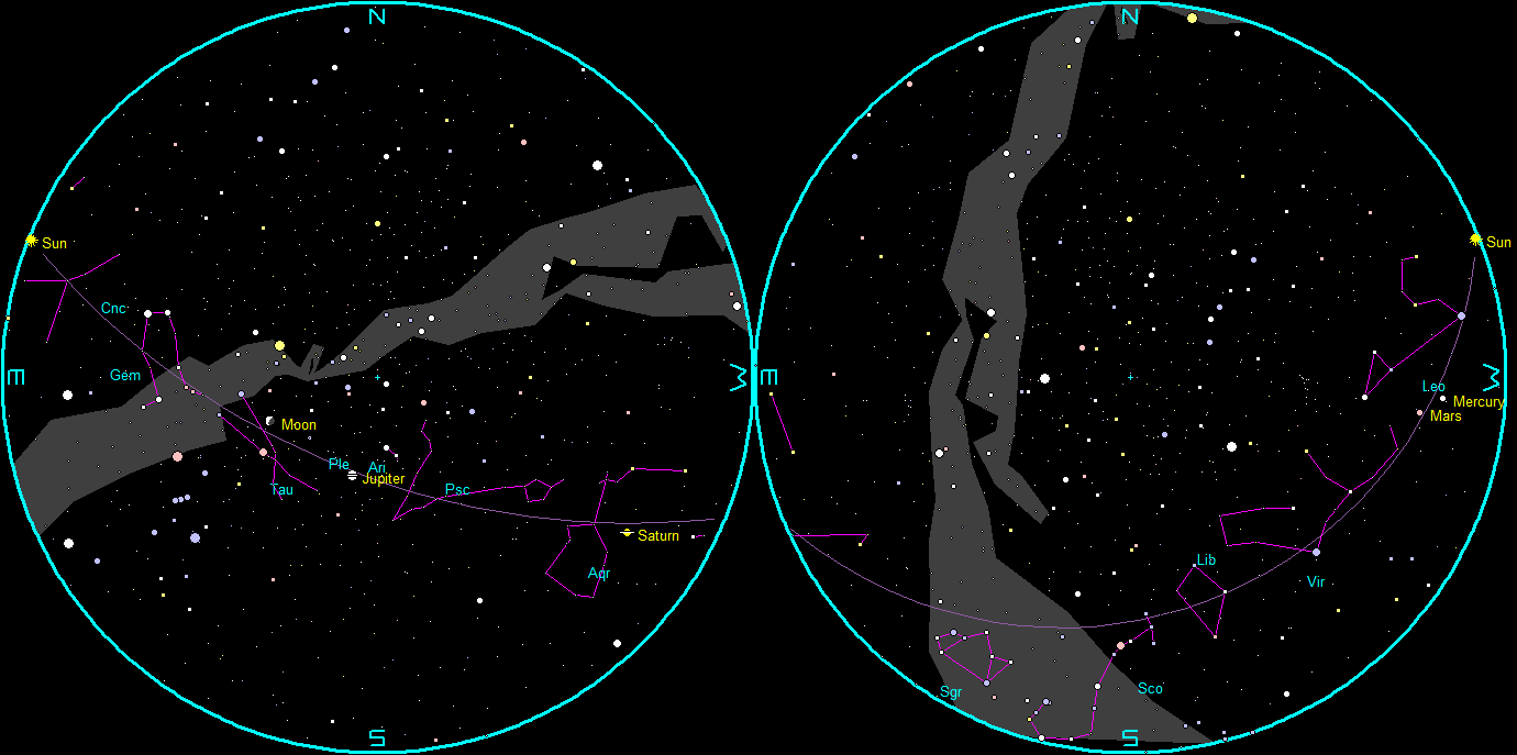 The naked-eye planets and the Moon at sunset and sunrise on a single night, starting with sunset on the right on August 9, 2023. The night ends on the left with sunrise on the 10th. Venus is not in the sky at either sunset or sunrise, being south of the Sun. Large images can be truncated on the right. Click or tap on the image to enlarge and display the complete image. Created using my LookingUp app and GIMP.